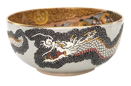 Lotto 23 Bowl in porcellana, Giappone decorata in policromia e oro da una figura femminile con drago circondata da numerosi volti di personaggi, cm 9x18,5