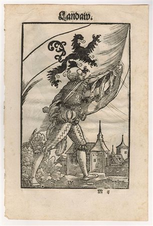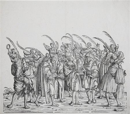 Tavola in ristampa tratta da "Triumph Des Kaiser Maximilian I", serie ideata nel 1512 in 139 tavole destinate ad un fregio che celebrava i successi dell'imperatore Massimiliano I, pubblicata nel 1526. La serie fu stampata postuma dopo il ritrovamento delle matrici. Fogli dalla prima tiratura di Vienna del 1796.