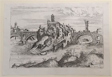 Paesaggio romano con il Ponte di Fabrizio e parte dell’Isola di Tiberio, 1561
