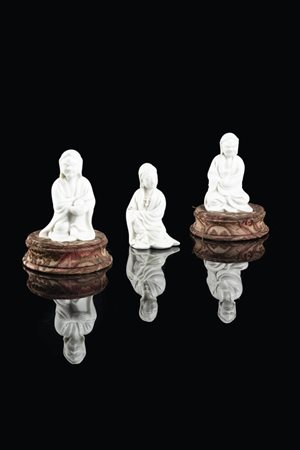 Tre figure di saggi e Guanyin in porcellana Blanc de Chine, Cina, dinsatia Qing, XX secolo.