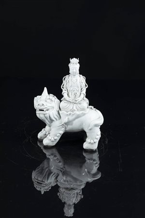 Blanc de Chine rappresentante Guanyin su animale fantastico, Cina, dinastia Qing, XIX secolo.