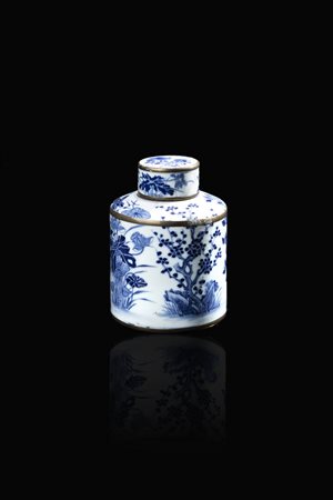 Porta tè tondo in porcellana bianca e blu, Cina, dinastia Qing, XIX secolo.