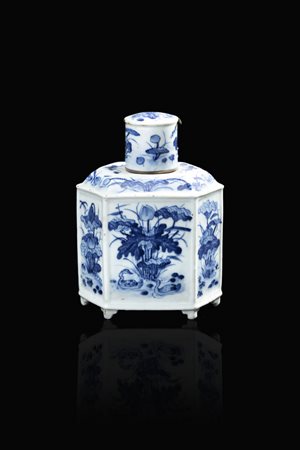 Porta tè esagonale in porcellana binca e blu, Cina, dinastia Qing, XIX secolo.