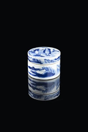 Scatolina in porcellana bianca e blu dipinta con personaggi, Cina, dinastia Qing, XIX secolo.