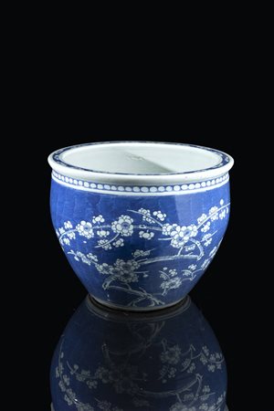 Vasca in porcellana bianca e blu dipinta con fiori di ciliegio, Cina, diastia Qing, XX secolo.