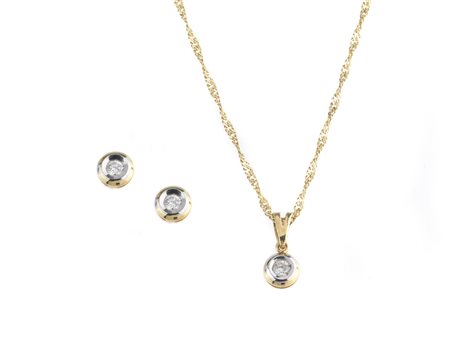 composta da una catena girocollo a maglia sottile con pendente in diamante taglio brillante rotondo di ct 0,13 circa e da un paio di orecchini per ct 0,25 circa complessivi, castoni a cipolla in oro giallo e bianco. Lunghezza collana cm 23,5 , peso complessivo gr. 7 -