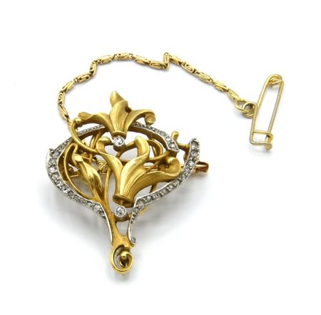 in oro a basso titolo, di gusto Liberty con piccoli diamanti taglio antico e perla pendente di 3,5 mm