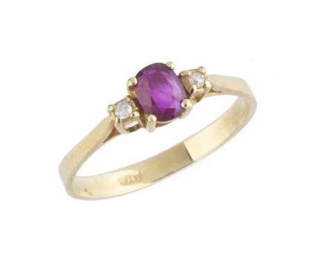 in oro giallo 18kt, al centro un rubino ovale affiancato da due diamanti. Peso complessivo gr. 2 circa, misura 12,5 -