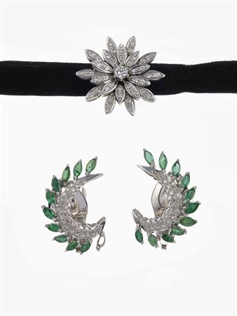 Lotto 3 Orecchini con diamanti e smeraldi e pendente con diamanti