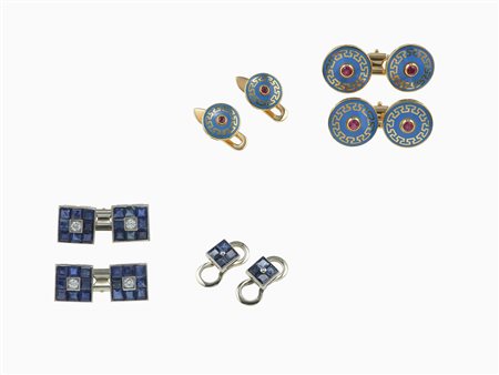 Lotto 23 Lotto composto da due paia di bottoni da polso con bottoni da sparato con smalti policromi, diamanti e zaffiri