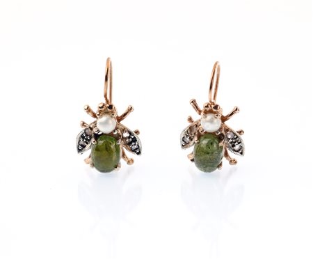 Lotto 9 Orecchini a mosca in oro, con perla, tormaline e diamanti
