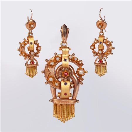 Oro a basso titolo e pietre colorate. Pendente cm 8, orecchini cm 6. Peso complessivo gr. 26,90. -