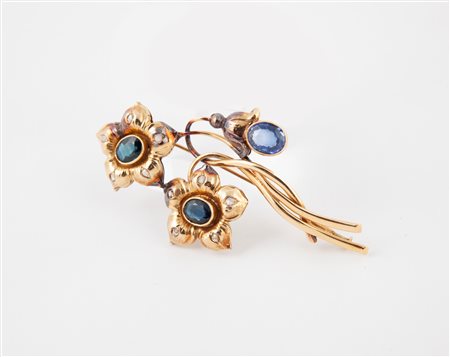 Lotto 23 Spilla tre fiori in oro, diamanti e zaffiri