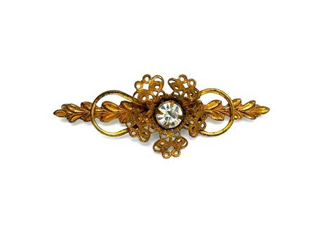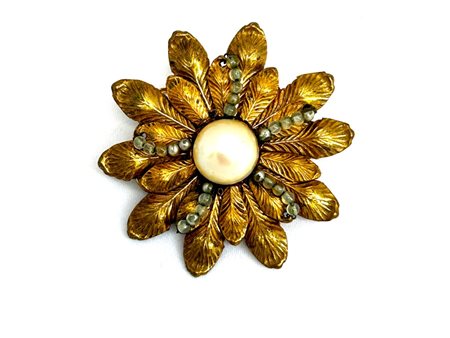 Miriam Haskell, spilla in metallo dorato, perline in vetro e perla simulata
