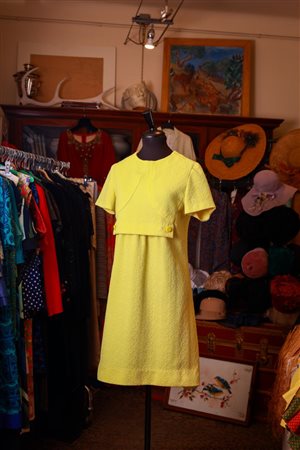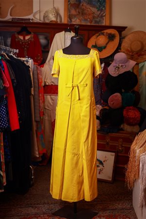 In cotone giallo, scollo quadrato ornato, come i bordi delle mezze maniche, da paillettes opalescenti, fiocco ornamentale al centro