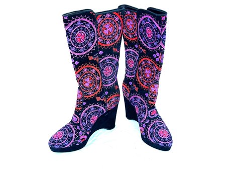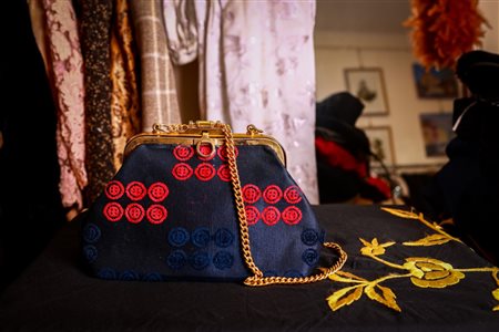 operato blu con decori circolari in velluto, chiusura in metallo dorato