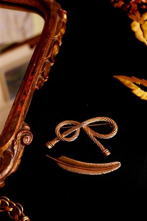 • Miriam Haskell, spilla in metallo dorato, perline in vetro e perla simulata