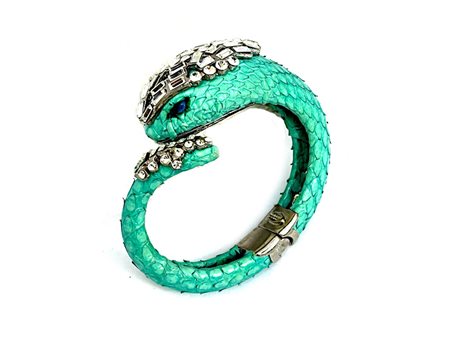 • Roberto Cavalli, Bracciale animalier in pitone azzurro e cristalli Swarovsky