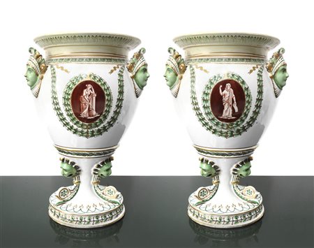 Lotto 6 Coppia vasi giustinianei, 19° secolo h cm 30 Vasi in porcellana biaca con decorazioni nei toni del verde e triplici medaglioni raffiguranti figure classiche. Base rotonda con teste leonine.Vasi in porcellana biaca con decorazioni nei toni del verde e triplici medaglioni raffiguranti figure classiche. Base rotonda con teste leonine.Presente incollatura su una base