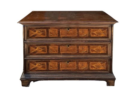 Lotto 15 Cassettone in legno di palissandro con intarsi geometrici in legno chiaro sul fronte, 19° secolo h cm. 84,5 x 110 x 51