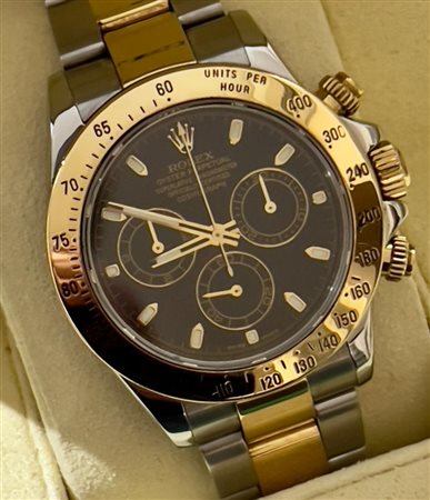 Marca Rolex Modello (Orologio) Daytona Numero di referenza 116523 Carica Automatico Materiale della cassa Oro/Acciaio Materiale cinturino Oro/acciaio Anno di produzione 2007 Corredo scatola di fornitura, documenti originali Rolex Carica Automatico Cassa Materiale della cassa Oro/Acciaio Diametro 40 mm Impermeabile 10 ATM Materiale lunetta Oro giallo Vetro Vetro zaffiro Quadrante Nero Numeri sul quadrante Senza numeri Cinturino Materiale cinturino Oro/acciaio Colore cinturino Oro/acciaio Chiusura Déployante Materiale chiusura Oro/Acciaio Funzioni Cronografo OROLOGIO PERFETTAMENTE FUNZIONANTE -