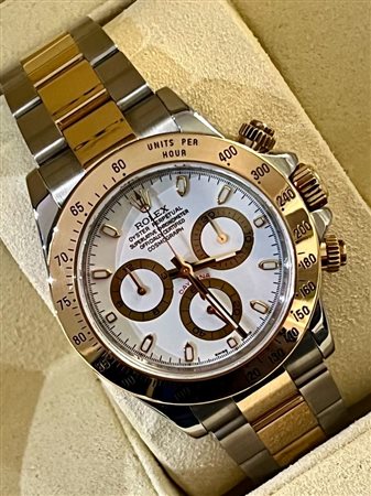 Marca Rolex Modello (Orologio) Daytona Numero di referenza 116523 Carica Automatico Materiale della cassa Oro/Acciaio Materiale cinturino Oro/acciaio Anno di produzione 2008 Corredo scatola di fornitura, documenti originali Rolex Carica Automatico Materiale della cassa Oro/Acciaio Diametro 40 mm Impermeabile 10 ATM Materiale lunetta Oro giallo Vetro Vetro zaffiro Quadrante Bianco Numeri sul quadrante Senza numeri Cinturino Materiale cinturino Oro/acciaio Colore cinturino Oro/acciaio Chiusura Déployante Materiale chiusura Oro/Acciaio Funzioni Cronografo OROLOGIO PERFETTAMENTE FUNZIONANTE -