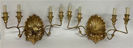 Lotto 1203 Coppia di applique a quatto luci in legno intagliato e dorato a foggia di valva di conchiglia. Bracci mossi in metallo (L. cm 52) (difetti)