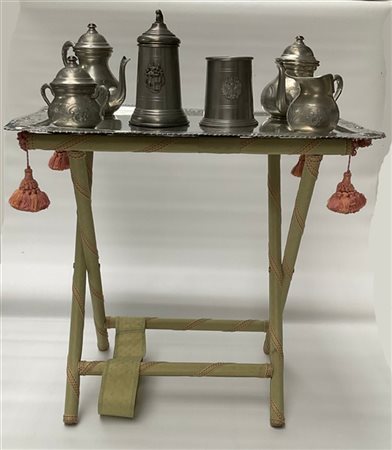 Lotto 1205 Servizio in peltro composto da vassoio, teiera, caffettiera, zucchieriera, lattiera unito a due boccali dello stesso materiale e un reggivassoio a trespolo (lievi difetti)