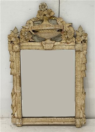 Lotto 1206 Antica specchiera in legno e stucco decorato a fiori e foglie con cimasa sormontata da vaso fiorito. Tracce di doratura (cm 97x60) (difetti e restauri)