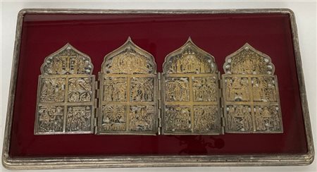 Lotto 1207 Icona russa da viaggio, secolo XIX. Diverse scene sacre, quattro elementi in bronzo con tracce di smalto. Entro teca (cm 47x27) (difetti)