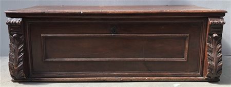 Lotto 1208 Cassapanca in noce con fronte riquadrato e montanti scolpiti a motivi vegetali. Lombardia, secolo XVII (cm 166x58x60) (difetti e restauri)