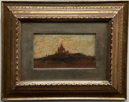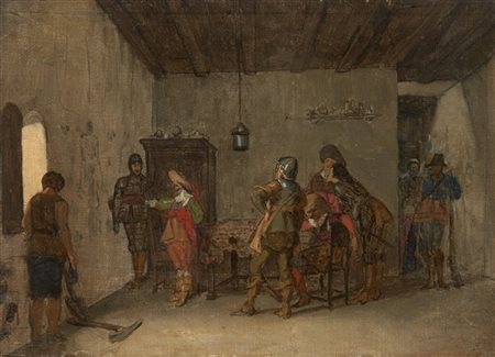 (Attr.) "Bozzetto per scena storica", olio e tracce di matita su tela applicata a tavoletta (cm 18x25) Al retro: cartiglio. In cornice (difetti)