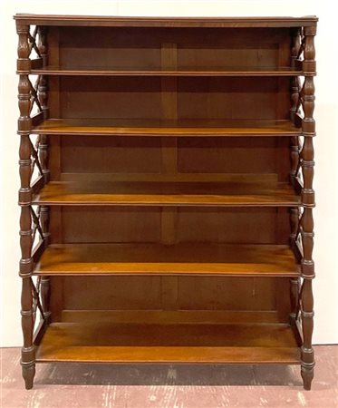 Lotto 1210 Etagère a cinque ripiani in mogano con montanti e traverse laterali tornite, bordi scanalati. Secolo XIX (cm 105x130x27,5) (difetti)