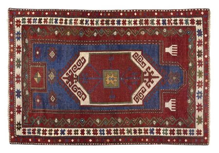 Lotto 1214 Tappeto Kazak Fachralo, Caucaso, fine secolo XIX. Decoro con medaglione esagonale sopra un Mirab a fondo blu. Bordura a stelle su fondo bianco (cm 187x121) (difetti)