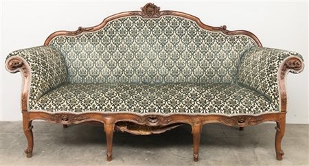 Lotto 1216 Divano a orecchioni in legno intagliato a otto gambe mosse, schienale sagomato centrato da valva di conchiglia entro volute, braccioli a ricciolo e bordure traforate. Lombardia, secolo XVIII (L. cm 233) (difetti e restauri)
