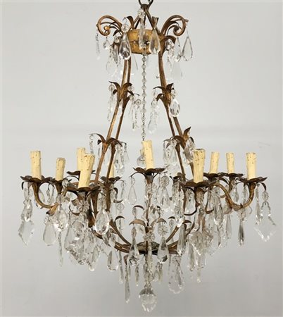 Lotto 1218 Lampadario a dodici luci in metallo dorato e pendenti in vetro molato (h. cm 120) (mancanze, difetti e rotture)