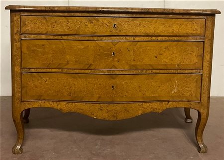 Lotto 1221 Cassettone a balestra lastronato in radica di legni vari a tre cassetti sul fronte. Piano sagomato e gambe mosse. Secolo XVIII (cm 122x92x61) (difetti e restauri)