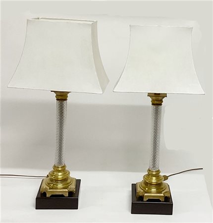 Lotto 1222 Coppia di lampade a colonna in vetro molato, basi in ottone dorato su sostegno in legno (h. cm 55) (difetti)