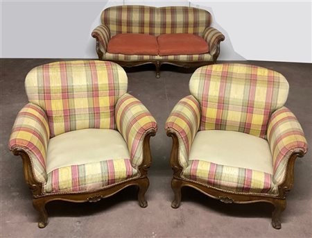 Lotto 1223 Fornitura da salotto composta da divano e coppia di poltrone in legno intagliato rivestite in tessuto (cm 177x80x88 e 80x82x75) (difetti e poltrone mancanti dei cuscini nelle sedute)