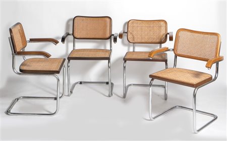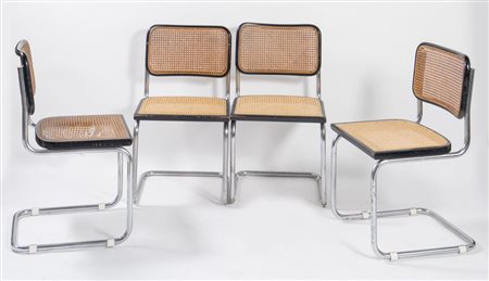 Lotto 16 MARCEL BREUER Quattro sedie con struttura in metallo cromato e seduta in legno e rattan modello 'Cesca'. Prod. Gavina, Italia, 1980 ca. Cm 85x47x53. (difetti)
