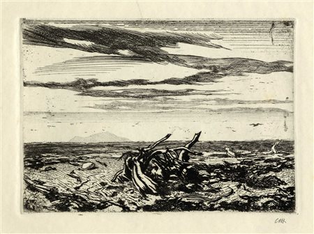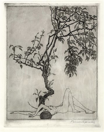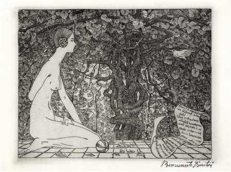 Lotto 265 Benvenuto Disertori, Capriccio. Ante 1916. Bulino, acquaforte e puntasecca. Inciso: mm 181x281. Lastra: mm 233x296. Foglio: mm 349x500. bellini-alberti, 20. Firmata a penna e inchiostro di china in basso a destra e titolata al centro. Sulla base di una certa analogia stilistica e compositiva con l'acquaforte Autunno (bellini-alberti, 59), è possibile ipotizzare che nella donna sia da riconoscere la personificazione dell'Estate. Provenienza: Eredi Disertori. (1)