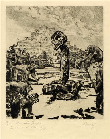 Lotto 252 Anselmo Bucci, Il libro della Giungla. Lotto composto di 8 incisioni. 1925. Incisioni all'acquaforte. mm 300x260 cad. Fogli: mm 562x380 cad. Tutte con firma a matita in basso a destra, titolo e tiratura in basso a sinistra. I titoli delle 8 incisioni sono: La caccia di Kaa; I fratelli di Mogwli; Mogwli [Presentazione]; Al servizio della Regina; Alla tigre!; Toomai degli elefanti; Rikki-Tikki-Tavy; La foca bianca. Tutti gli esemplari sono in tiratura 1/10 o 2/10. Al verso, 7 incisioni recano la targhetta con i dati dell'opera. (8)