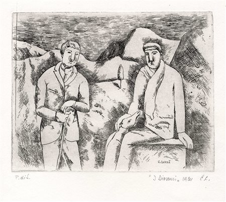 Lotto 255 Carlo Carrà, I dioscuri. 1924. Acquaforte. mm 185x240. Foglio: mm 505x370. Firma in lastra in basso a destra. A matita, in basso ai lati, titolo, data, sigla e "P. di S.". In basso a sinistra timbro a secco de "Luigi de Tullio stampatore". (1)