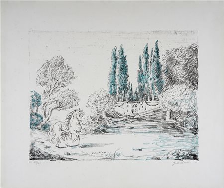 Lotto 257 Giorgio De Chirico, Cavallo a Villa Falconieri. 1954. Litografia. mm 330x434. Foglio: mm 500x600. Firma a matita in basso a destra, controfirmata in lastra in basso al centro, tiratura a matita in basso a sinistra. Es. 110/125. (1)