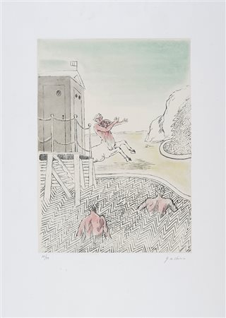 Lotto 258 Giorgio De Chirico, L'arrivo del centauro. 1973. Acquatinta su velina applicata a carta. mm 440x320. Foglio: mm 700x505. Firmata a matita in basso a destra e numerata in basso a sinistra. Es. 45/99. Doppio timbro a secco in basso ai lati: uno dell'artista e uno di Alberto Caprini stampatore in Roma. (1)