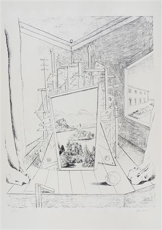 Lotto 259 Giorgio De Chirico, Interno metafisico con lago. Anni '60 del XX secolo. Litografia. mm 991x705. Firma a matita in basso a destra e "p.d'a." in basso a sinistra. L'artista ha prodotto dipinti degli interni metafisici, tra i quali Interno metafisico con officina, Interno metafisico con alberi e cascata e Interno metafisico con la mano di Davide. (1)