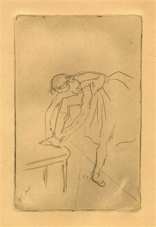 Lotto 261 Edgar Degas, Danseuse mettant son chausson. 1892. Acquaforte. mm 180x114. Foglio: mm 325x250. DELTEIL, 36. (1)