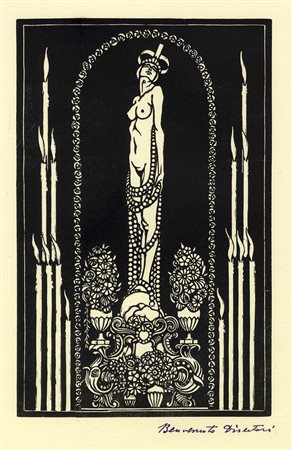 Lotto 264 Benvenuto Disertori, La ninfetta. 1913. Acquaforte e bulino. Inciso: mm 179x181. Lastra: mm 199x200. Foglio: mm 535x390. bellini-alberti, 17. Firmata a penna a sfera nera in basso a destra e controfirmata in lastra in basso a sinistra. La farfalla in volo, che nella tradizione iconografica occidentale è simbolo dell'anima, ma anche di fugacità, incostanza e vanità, potrebbe avere in questo contesto una funzione semplicemente decorativa; essa è uno dei soggetti più ricorrenti nella cultura figurativa liberty, dalla quale derivano in questa incisione sia il linguaggio linearistico, sia la tipologia stilizzata e il carattere ornamentale del nudo femminile. Provenienza: Eredi Disertori. (1)
