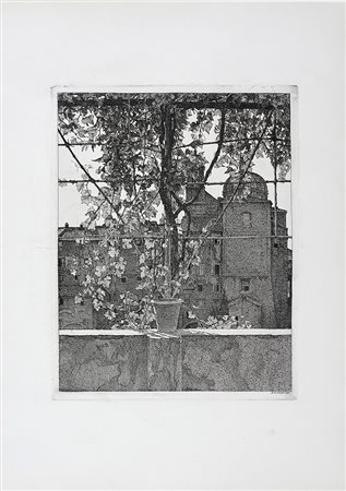 Lotto 266 Benvenuto Disertori, Veduta con tralci di vite. 1949. Acquaforte su carta vergellata Fabriano con filigrana "Lupa di Roma". Inciso: mm 264x335. Lastra: mm 283x345. Foglio: mm 490x680. bellini-alberti, 64. Firmata in lastra. In lastra inciso: "Touring club italiano 1949" e sotto "Degli amici del touring". Provenienza: Eredi Disertori.