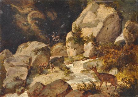 Lotto 217 Edmund von Wörndle (Wien/Vienna 1827 - Innsbruck 1906) Cervi nella gola Mühlauer Klamm, Innsbruck, 1874;Olio su carta su cartone, 30,5 x 43 cm, ritocchi